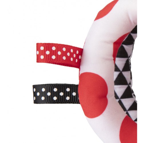 Kontrastní míček s chrastítkem SENSORY. Díky praktickému tvaru lze hračku jednoduše uchopit. Disponuje šustícími elementy, chrastítkem a látkovými stužkami. Senzorické barvy stimulují rozvoj smyslů dítěte.