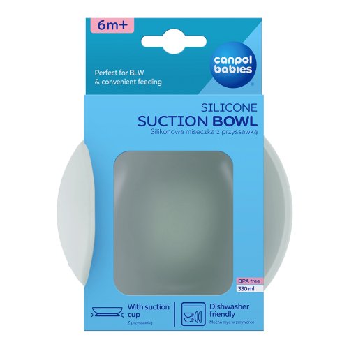 Dětská miska Canpol babies má protiskluzovou přísavku, která zabraňuje nekontrolovanému pohybu misky po povrchu stolu nebo desky krmící židličky a zabraňuje převrácení nebo úplnému shození nádobí na podlahu. Zaoblené tvary a zvýšený, profilovaný okraj misky usnadňují dítěti nabírání jídla. Je vyrobena ze 100% vysoce kvalitního potravinářského silikonu. Silikonové nádobí je flexibilní a trvanlivé, odolné proti nárazům a pádům, nepohlcuje pachy. Perfektní pro podávání polévky, těstovin, jogurtu s ovocem nebo mléka s cereáliemi. Miska Canpol babies se snadno čistí a je odolná vůči vysokým teplotám - lze ji ohřívat v mikrovlnné troubě a mýt v myčce.