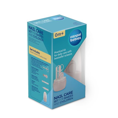 Kompletní sada na nehty pro miminka zabalená v praktickém voděodolném pouzdře, které umožňuje hygienické skladování a přenášení. Sada na nehty pro miminka se skládá ze 4 prvků – nůžek, šikovných kleštiček na nehty, jemného pilníku a pinzety.