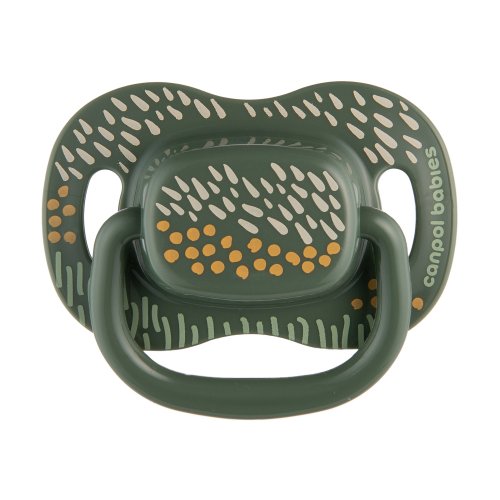 Speciálně profilovaný štítek umožňuje dítěti volně dýchat nosem a minimalizuje otisky dudlíku na jemnou tvář dítěte. Další větrací otvory umožňují pokožce dýchat a zabraňují podráždění. Praktický úchyt dudlíku usnadňuje jeho podávání dítěti a umožňuje připevnit řetízek nebo stuhu na dudlík, který ochrání dudlík před ztrátou nebo pádem na zem a zašpiněním. Canpol babies symetrický silikonový dudlík Mountains je pevný a odolný proti deformaci.