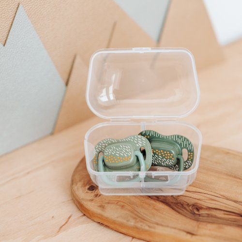 Dudlík je bezpečný a snadno se udržuje v čistotě, a to díky modernímu pouzdru, kterou lze použít jak pro skladování, tak pro rychlou a pohodlnou dezinfekci v mikrovlnné troubě. Stačí trocha vody a 2 minuty, aby byly dudlíky hygienicky čisté. Při výrobě nebylo použito BPA ani jiné škodlivé látky.