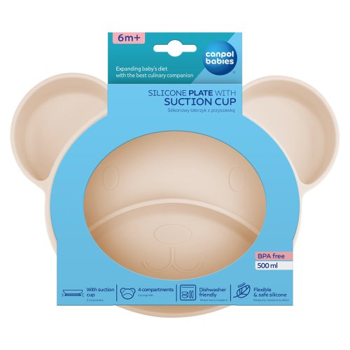 Talíř má protiskluzovou přísavku, která zabraňuje nekontrolovanému pohybu po povrchu stolu nebo desky krmící židle a zabraňuje převrácení nebo úplnému shození nádobí na podlahu. Talíř je vyroben ze 100% vysoce kvalitního potravinářského silikonu. Čtyři přihrádky usnadňují porcování a třídění různých pokrmů, což povzbuzuje miminko, aby zkoušelo nové chutě a jedlo samo. Silikonové nádobí je flexibilní, odolné a nerozbitné, což je pro malé děti velmi důležité. Lze mýt v myčce a ohřívat v mikrovlnné troubě.