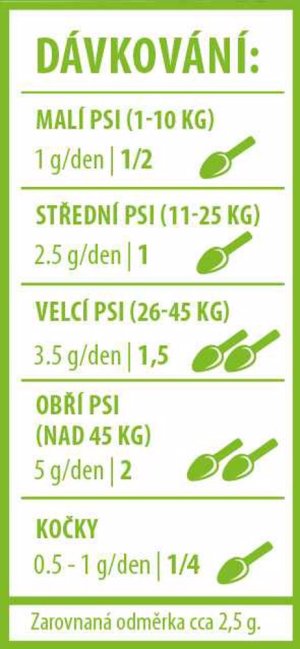 Přírodní zdroj aminokyselin, beta-karotenu, vitamínů skupiny B, D, E a K, minerálních látek. Spirulina je přirozeným přírodním zdrojem bílkovin (60-70%). Jedná se o komplexní protein obsahující veškeré nepostradatelné aminokyseliny. Dále obsahuje vitamíny skupiny B, D, E a K, minerální látky a železo. Je skvělým zdrojem koncentrovaných a lehce vstřebatelných živin, proto se řadí mezi tzv. superfoods. Má pozitivní vliv na vitalitu, celkové fungování organismu a jeho obranyschopnost. Je vhodným doplňkem pro BARF zejména pro psy v zátěži či v období stresu. Složení: 100 % Spirulina Platensis. Analytické složky: hrubý protein 67,98 %, hrubá vláknina 12,25 %, obsah tuku 5,62 %, hrubý popel 8,39 %. Krmný návod: Podává se zamíchaná do krmiva dle doporučeného dávkování jako vhodný doplněk k BARF stravě. Při použití u výstavních jedinců s bíle zbarvenou srstí může dojít k nežádoucímu zabarvení. Dávkování: na 10 kg psa: ¼ lžičky denně.