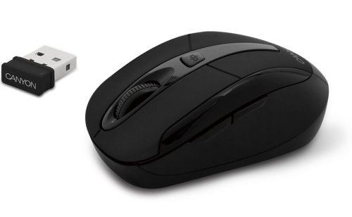 Optická bezdrátová myš s malým přijímačem USB, rozlišením 800 dpi / 1 200 dpi / 1600 dpi, 6 tlačítek a rolovací kolečko.