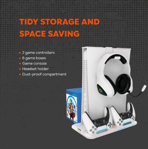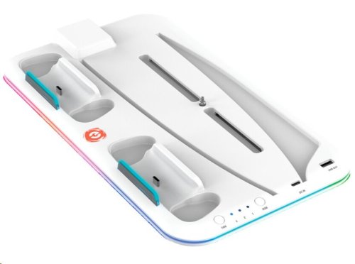 Napájení pomocí USB-C USB 2.0 pro nabíjení dalších zařízení RGB Úložiště disků a herního příslušenství Nabíjení dvou ovladačů PS5 Držák sluchátek Barva bílá