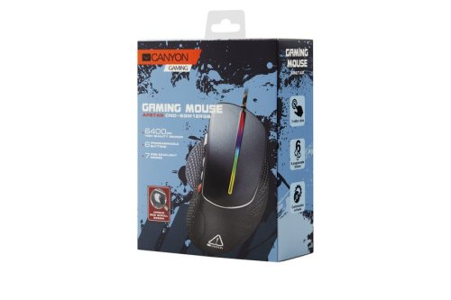 Drátová herní myš s 6 nastavitelnými tlačítky, pixart optický senzor, 6 úrovní DPI až do úrovně 6400, životnost až 2 miliony kliknutí, USB PVC opletený kabel v délce 1,65m, pogumovaný povrch a barevná RGB podsvícení, rozměr123x81x53mm, váha 150g