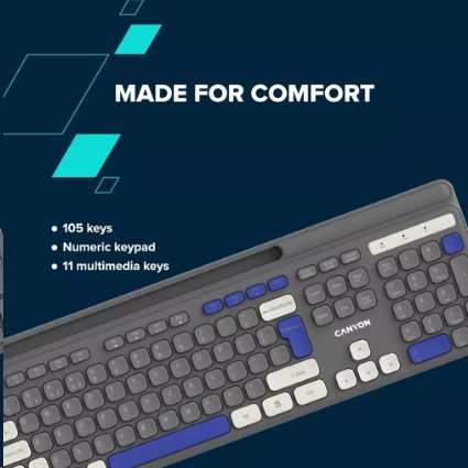 Bezdrátová klávesnice Canyon HKB-W03 vás osvobodí od kabelů a nepořádku na pracovním stole. Tato klávesnice má elegantní design a chytré funkce, které vám umožní snadno pracovat a bavit se. Díky rozložení v plné velikosti se 105 klávesami, včetně praktických multimediálních zkratek, je tato klávesnice Canyon vaším spolehlivým pomocníkem pro jakýkoli úkol. Díky spínačům s nůžkovým mechanismem je každý stisk klávesy plynulý a tichý. Klávesnice HKB-W03 s laserovým gravírováním a matné povrchové úpravě má tenký a ergonomický design. Tato klávesnice je napájena jednou baterií AAA, takže je připravena kdykoli budete potřebovat. Pogumované nakloněné nožičky nabízejí stabilitu a pohodlí a vy se tak můžete soustředit na práci. Je čas převzít kontrolu nad svým pracovním prostorem!