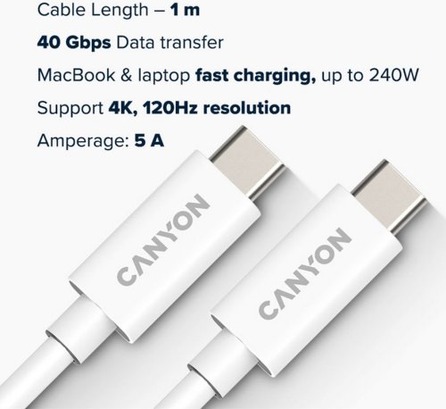 Tento model poskytuje rychlost 40 Gb/s při přenosu dat, videa a zvuku a rychlé nabíjení pro MacBook nebo jiný notebook. Maximální kapacita 5 A poskytuje opravdu rychlé nabíjení. Hlavní charakteristikou však je, že podporuje jednoduché rozlišení 8K, 60 Hz; 4K, 120 Hz nebo duální 4K, 60 Hz. Kabel je také vybaven čipem E-MARK, který zvyšuje přenosový výkon až na 240 W a poskytuje dostatečnou šířku pásma pro rychlý a kompletní přenos pro video soubory. Také čip E-MARK reguluje napájení, což zaručuje, že používání kabelu je bezpečné a efektivní. Kabel USB-C na USB-C má optimální délku 1 metr a je k dispozici v černé a bílé barvě. Vynikající kombinace ceny a kvality.