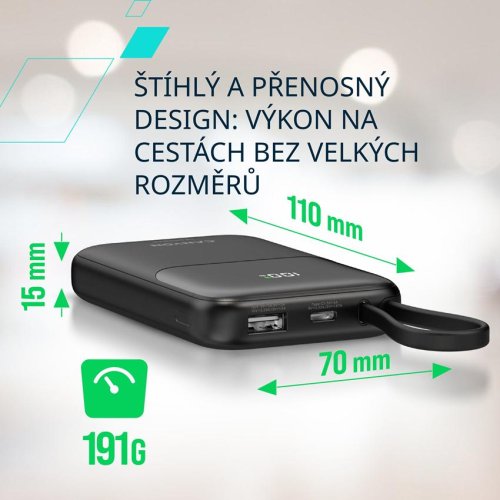 Kapacita 10 000 mAh je zlatý střed – dost energie na několikanásobné nabití telefonu nebo prodloužení výdrže tabletu na celý den, a přitom snadno přenosné provedení.