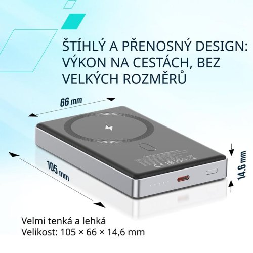 Už vás nikdy nezpomalí vybitá baterie! OnPower 510 je navržena tak, aby vám poskytla vysoký výkon a zároveň je lehká a přenosná. Tato ultratenká powerbanka s působivou kapacitou 10 000 mAh poskytuje veškerou energii, kterou potřebujete, abyste měli svá zařízení vždy nabitá a připravená. Díky bezdrátovému výstupu 15W a funkci Magsafe powerbanku použijte jednoduše kdekoli a kdykoli - stačí přiložit váš telefon na místo a nechat OnPower 510 udělat zbytek. Pokud dáváte přednost kabelovému nabíjení, k dispozici je 20W výstup USB-C, který dokáže bleskurychle současně nabíjet telefony, tablety a další zařízení zároveň s powerbankou. Powerbanka je vyrobena z prvotřídní slitiny hliníku a ohnivzdorných materiálů ABS+PC, takže je stejně odolná jako stylová. Je kompaktní a lehká, takže se snadno vejde do každé kapsy nebo tašky. Bude tou nejlepší volbou pro váš život na cestách. Zůstaňte ve spojení se světem, produktivní a bez stresu s OnPower 510 - dokonalým spojením energie, kompaktnosti a designu. Převezměte kontrolu nad svým dnem, ať už vás zavede kamkoli!