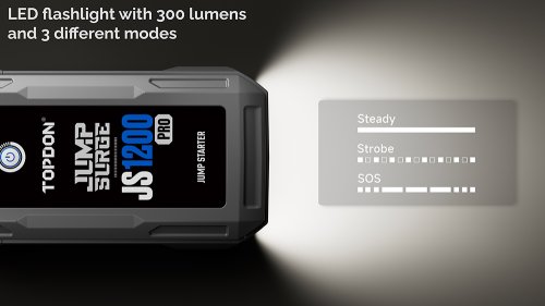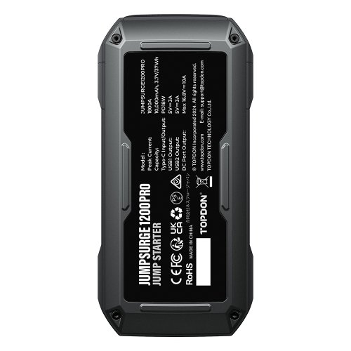 Technické specifikace: Značka: TOPDON Model: Car Jump Starter JumpSurge 1200 PRO Kapacita: 3,7V , 10000mAh/37 Wh Typ baterie: Li-ion USB-A (2x)výstup: 5V/3A (15W) USB-C vstup/výstup: PD18W, 5V/3A 15W, 9V/2A (18W) DC Jack výstup: 16,8V/10A (168W) Rozměry: 8,5 x 17,5 x 3 cm Hmotnost: 750 g Max. výstupní proud pro vozidla: 1800A LED světlo: stálé, stroboskop, SOS světlo Provozní teplota: od -10°C do 40°C Skladovací teplota: od -20°C do 75°C Ochrana: IP64