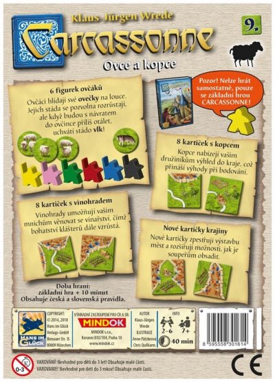 Hra obsahuje: nové kartičky krajiny, 6 figurek ovčáků, 8 kartiček s kopcem, 8 kartiček s vinohradem a česká a slovenská pravidla