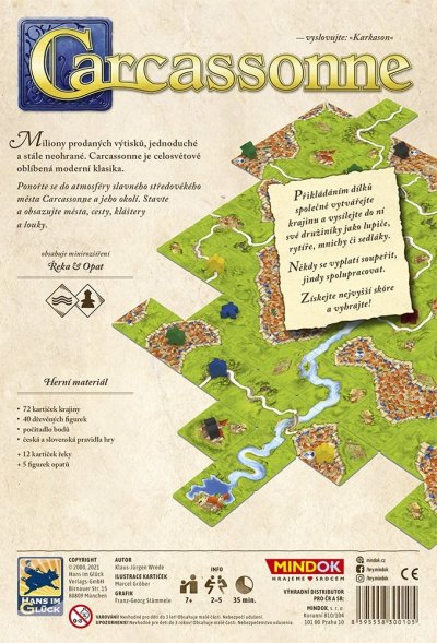 Základní vydání slavné hry Carcassonne. Součástí balení je navíc minirozšíření - řeka a 5 figurek opatů.
