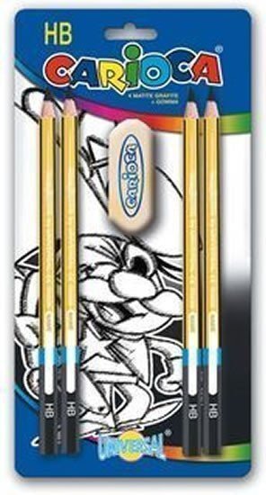Sada trojhranných grafitových tužek Carioca Black. Sada obsahuje 4 tužky s tuhami tvrdosti HB a gumu. Vysoce kvalitní tuha, odolná při pádu. Snadno se gumuje a ořezává. Vhodné do škol i kanceláří. Nevhodné pro děti do 3 let.