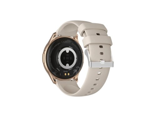 Moderní, fitness hodinky CARNEO Gear Essential druhé generace ve zlaté barvě s béžovým na dotek velmi příjemným silikonovým řemínkem a barevným SUPER AMOLED displejem s vysokým jasem a funkcí trvalého zobrazení času. Monitorují vaši denní aktivitu, úroveň stresu a lze je spárovat s mobilním telefonem a upozornit Vás na příchozí hovor nebo SMS. Hodinky umožňují telefonovat, aniž byste vytáhli telefon z tašky s vestavěným mikrofonem a reproduktorem až do vzdálenosti 10 m od telefonu.