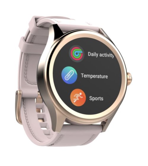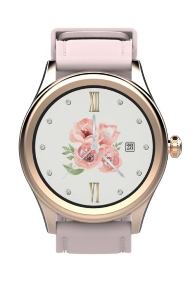 TECHNICKÉ PARAMETRY Barva: Zlatá Materiál: Kov + silikonový náramek v koženém designu Baterie: Dobíjecí baterie 300 mAh Obrazovka: 1,3-palcový kulatý IPS dotykový displej Rozlišení: 360 * 360 Pohotovostní čas: Přibližně 10 dny BT: 5.0 Odolnost: Odolnost vůči dešti - IPX67 Jazyky: Angličtina, Čeština, Slovenština, Maďarština, Němčina