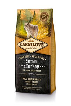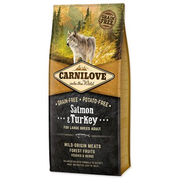 Složení: dehydrovaný losos (25 %), dehydrovaný krocan (20 %), žlutý hrách (20 %), kuřecí tuk (chráněno tokoferoly 10 %), kachní moučka (5 %), hydrolyzovaný losos (5 %), kuřecí játra (3 %), jablka (3 %), lososový olej (2 %), mrkev (1 %), lněné semínko (1 %), cizrna (1 %), hydrolyzované skořápky korýšů (zdroj glukosaminu, 0,05 %), extrakt z chrupavek (zdroj chondroitinu, 0,03 %), pivovarské kvasnice (zdroj mannan-oligosacharidů, 0,015 %), kořen z čekanky (zdroj frukto-oligosacharidů, 0,01 %), juka schidigera (0,01 %), mořská řasa (0,01 %), psyllium (0,01 %), tymián (0,01 %), rozmarýn (0,01 %), oregano (0,01 %), brusinky (0,0008 %), borůvky (0,0008 %), maliny (0,0008 %). Analytické složky: hrubý protein 36 %, obsah tuku 16 %, hrubý popel 7,8 %, hrubá vláknina 3 %, vlhkost 10 %, vápník 1,3 %, fosfor 1 %. Nutriční doplňkové látky na 1 kg: vitamín A (E672) 20 000 m.j., vitamín D3 (E671) 1 500 m.j., vitamín E (α-tokoferol) (3a700) 400 mg, zinek (E6) 85 mg, železo (E1) 70 mg, mangan (E5) 35 mg, jód (E2) 0,65 mg, měď (E4) 15 mg, selen (3b8.10) 0,25 mg. Metabolizovatelná energie: 3 790 kcal/kg. Krmný návod: Podávejte suché nebo navlhčené vodou. Denní dávka se bude lišit podle věku, velikosti, výkonu a prostředí. Doporučené denní dávkování je uvedené v krmné tabulce. Pokud podáváte krmivo Carnilove poprvé, v prvním týdnu podávejte smíchané s původním krmivem a postupně navyšujte podíl Carnilove v celkové denní dávce. Nezapomeňte ke krmení vždy připravit miskou s čerstvou pitnou vodou. Spotřebujte do data uvedeného na obalu. Uchovejte v suchém a chladném místě.