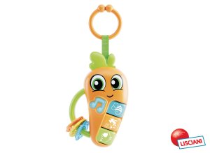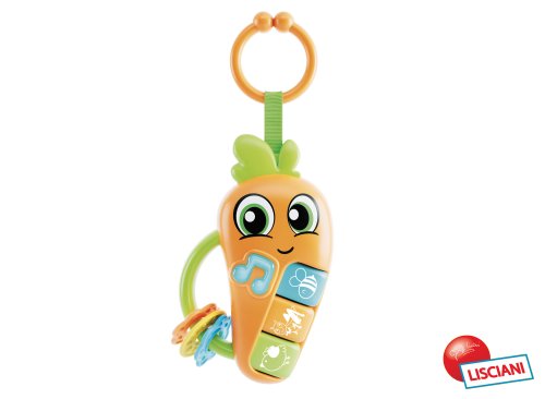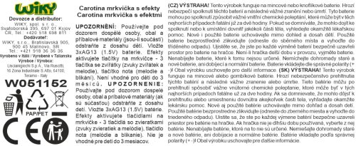 Carotina mrkvička s efekty. Velikost 16 cm. 3 tlačítka se zvířátky - opakované stisknutí střídá melodii a zvuk zvířátka. Tlačítko s notou spouští 2 různé melodie a bliká. Kroužek na zavěšení. Baterie 3xAG13 součástí.