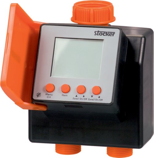 Časové spínače jsou určeny pro snadné vybudování jednoduchého automatického zavlažování se dvěma zavlažovacími větvemi. Nabízí dvě nezávisle naprogramovatelné zóny. Možnosti frekvence: 1,2,3,4,6,8,12 hodin, 1-7 dní. Připojují se na zahradní kohout a nepotřebují připojení do elektrické sítě, protože jsou napájeny alkalickou baterií 9V (nejsou součástí dodávky). Za časový spínač se napojí běžná zahradní hadice, která je dále připojena k jednotlivým nadzemním rozstřikovačům nebo kapkové závlaze. Časové spínače jsou vyrobeny z kvalitního plastu, který odolává povětrnostním vlivům, a jsou určeny i k venkovnímu použití. Pro správnou funkci časového spínače musí být dodržen tlak vody min. 0,5 bar a max. 8 barů.