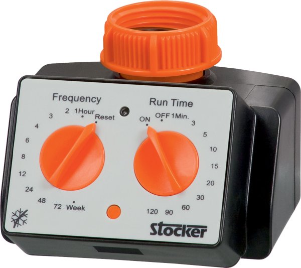 Časové spínače jsou určeny pro snadné vybudování jednoduchého automatického zavlažování. Programovatelný - možnosti frekvence: 1, 3, 5, 10, 15 ,20, 30, 60, 90, 120 minut. Připojují se na zahradní kohout a nepotřebují připojení do elektrické sítě, protože jsou napájeny alkalickou baterií 9V (nejsou součástí dodávky). Za časový spínač se napojí běžná zahradní hadice, která je dále připojena k jednotlivým nadzemním rozstřikovačům nebo kapkové závlaze. Časové spínače jsou vyrobeny z kvalitního plastu, který odolává povětrnostním vlivům, a jsou určeny i k venkovnímu použití. Pro správnou funkci časového spínače musí být dodržen tlak vody min. 0,5 bar a max. 12 barů.