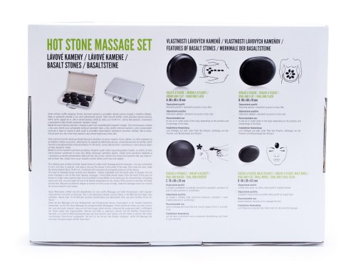 Sada obsahuje 14 kusů masážních lávových kamenů různého tvaru a velikostí pro dokonalou masáž celého těla. Kameny jsou uložené v hliníkovém kufříku, který jednoduše připojíte do el. sítě a necháte kameny nahřát na teplotu, která je vám příjemná (max. 70°C). Součástí balení jsou 2ks bandáží na chodidla pro praktické zafixování masážní kamenů.