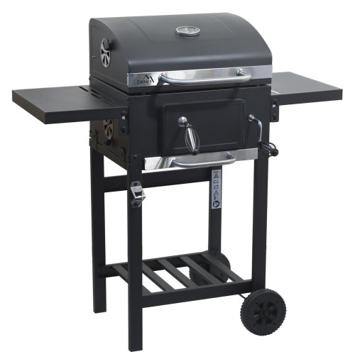 Další předností grilu je rošt na uhlí s nastavitelnou výškou, grilovací prostor je tak možné regulovat pomocí mechanismu na přední straně, dle požadávků daných pokrmů. Dvířka na čelní straně grilu významně usnadňují doplňování uhlí. Pro usnadněné číštění je potom určena zásuvka na popel ve spodní části grilu.