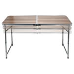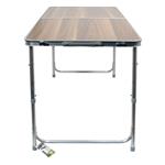 Stůl Double je skládací, teleskopický stůl z Aluminia, s rovnou plochou a vzorem kvalitně imitujícím dřevo.