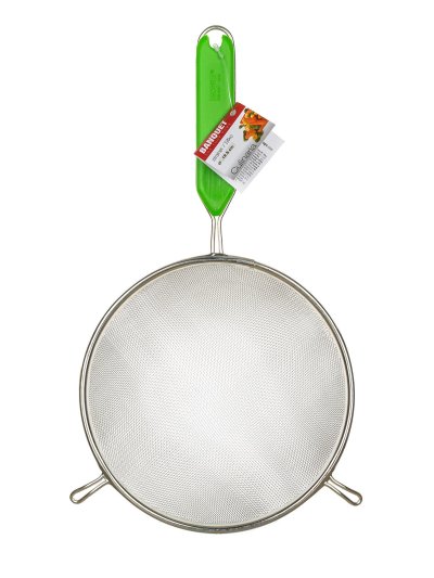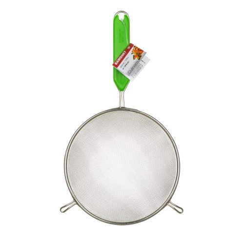 průměr: 19,5 cm materiál: pocínovaný kov, držadlo s plastovou vložkou - ABS barva rukojeťi: zelená hustota mřížky: 1 x 1 mm počet oček: 15 na cm2