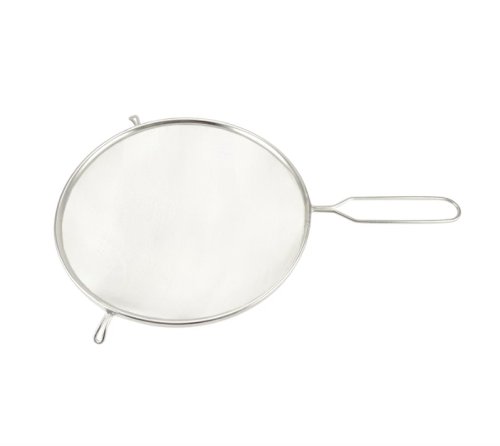 Kovové tkanivo pevně spojené s obrubou z ocelového plechu a držadlem s háčky z ocelového drátu. Galvanicky leskle pokoveno. Jemné síto, průměr 25 cm, délka s ručkou 42 cm. Není vhodné do myčky nádobí. EAN 5999563617099