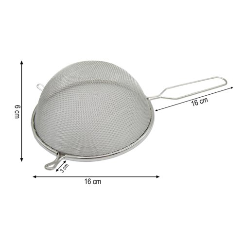 Kvalitní pevný nerezový cedník s ručkou, průměr 16 cm, výška 6 cm, délka s ručkou 32 cm, délka háčku 3 cm. Cedník je vybavený 2 háčky na zavěšení na hrnec nebo jinou nádobu. Doporučujeme ruční mytí. Hustota síta 1 x 1 mm. EAN 5902738211589