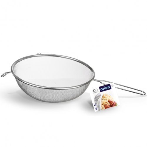 Nerezový cedník s ručkou a dvěma očky k zavěšení na hrnec. Průměr 21,5 cm, délka 37 cm. Vhodné do myčky nádobí. EAN 8592381098223