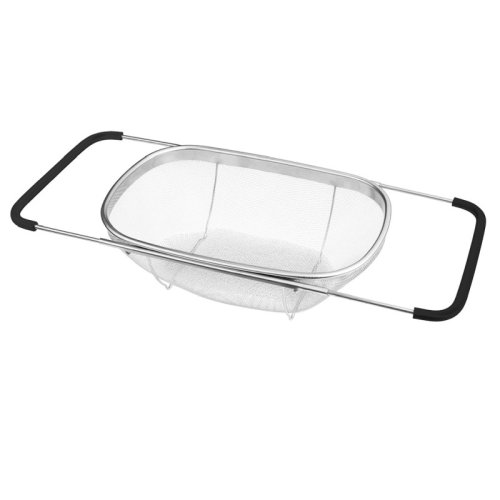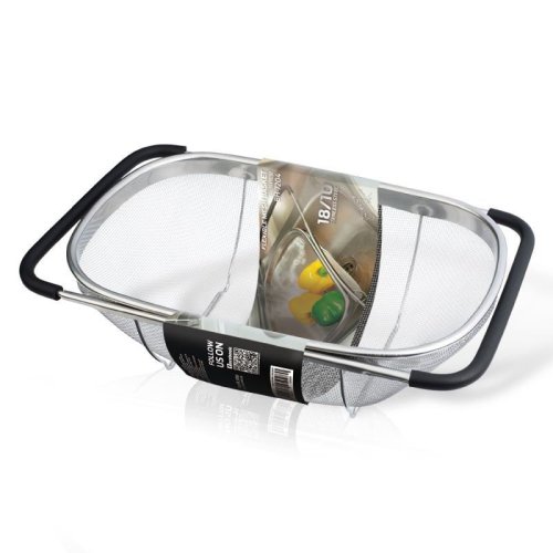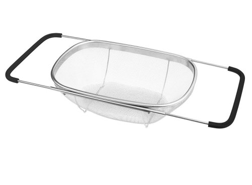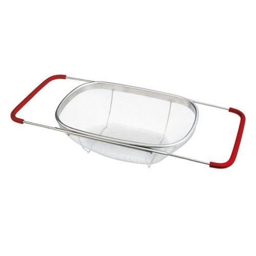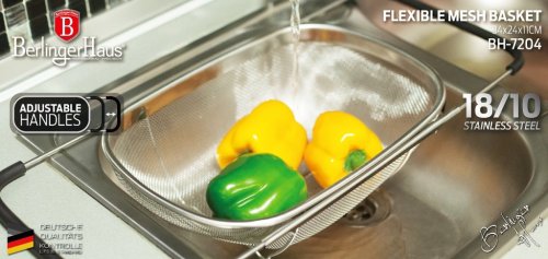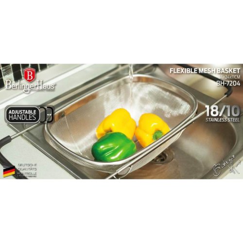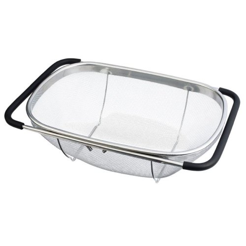 Praktický kuchyňský košík, který lze pohodlně umístit přímo do Vašeho dřezu. Díky vysunovacím rukojetím se dokonale přizpůsobí na šířku jakéhokoliv kuchyňského dřezu. Následně jej můžete využít jako cedník ke slévání těstovin nebo jako síto pro čištění potravin, zeleniny a ovoce. Tento velký cedník je vyrobený z nerezové oceli, má pevnou konstrukci a jeho postranní rukojeti se silikonovou úpravou nekloužou a dobře drží ve dřezu.