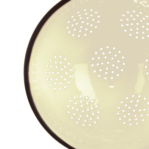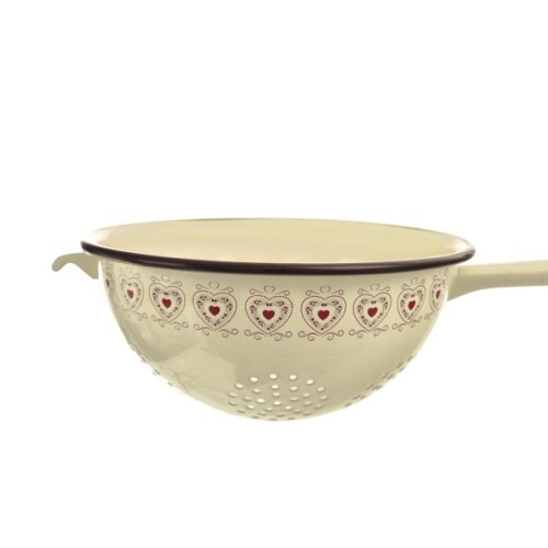 Bílý smaltový cedník se srdíčkovým dekorem o průměru 18 cm.