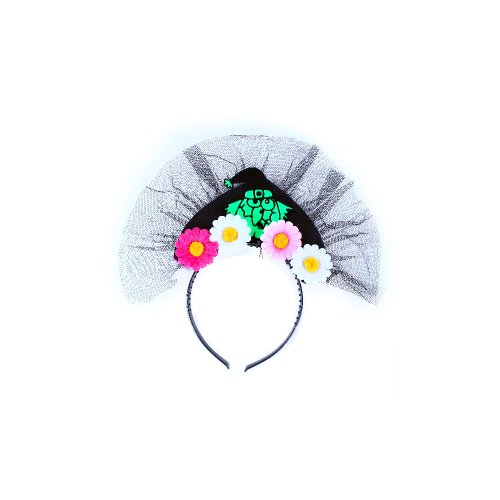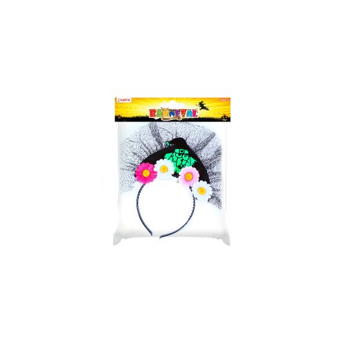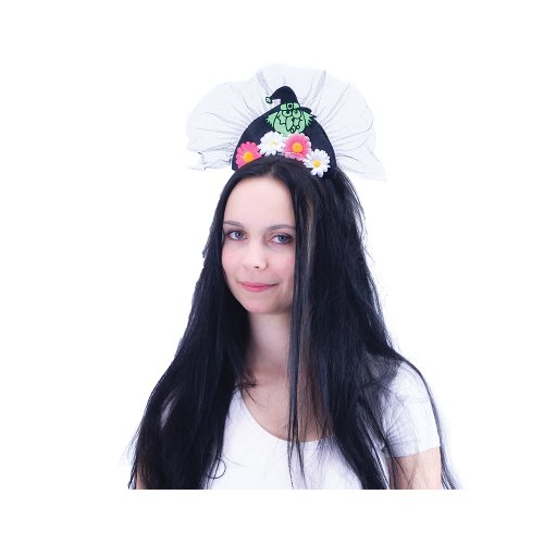 Senzační čelenka s čarodějnicí, zdobená barevnými kvítky. Tato karnevalová vychytávka je perfektním doplňkem na večírek nebo Halloween párty!