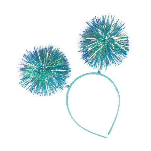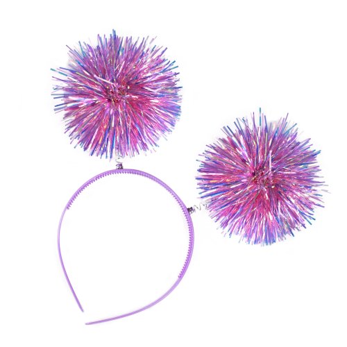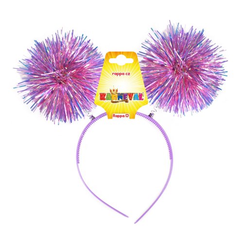 Karnevalová čelenka s třásněmi. Barevná plastová čelenka je zdobená třpytivými třásněmi ve tvaru koulí, které jsou připevněny na pružinkách.