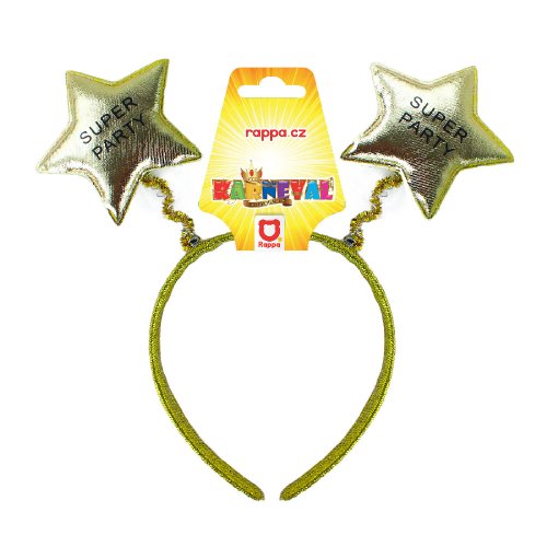 Karnevalová čelenka ve zlaté barvě je zdobená hvězdičkami s nápisem SUPER PÁRTY. Hvězdy jsou k čelence připevněny pomocí pružinek.