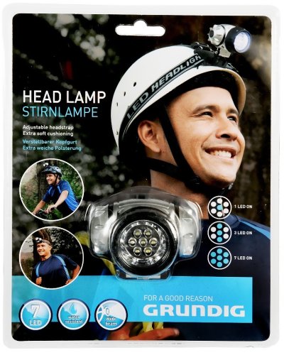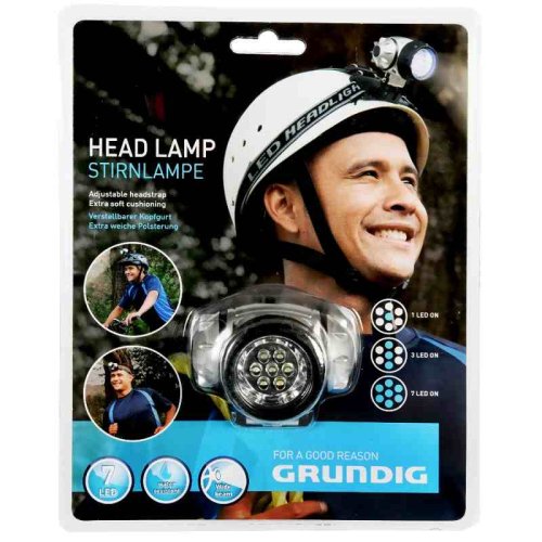 Čelovka GrundigTato čelovka od Grundigu zajišťuje dostatečnou svítivost se svými 7 LED diodami. Zároveň máte stále volné ruce na jiné věci. Při procházce se psem, běhání, kempování nebo jízdě na kole. Úhel sklonu lze upravit podle potřeby. Čelenka s gumičkou je nastavitelná a zajišťuje dostatečný komfort. Stačí nastavit jas mezi 1 LED, 3 nebo 7 LED a získáte úplný obraz. Podrobnosti :- Se 7 LED, nastavitelná intenzita světla (1 LED / 3 LED / 7 LED)- Všestranné použití: při jízdě na kole, procházce se psem, běhání, kempování, rybaření, na opravy atd.- s nastavitelným popruhem na hlavu, extra měkké polstrování- Provoz: přes 3 x AAA baterie (nejsou součástí balení)- Barva: Black & Silver, Rozměry: cca 23 cm x 18 cm x 7 cm