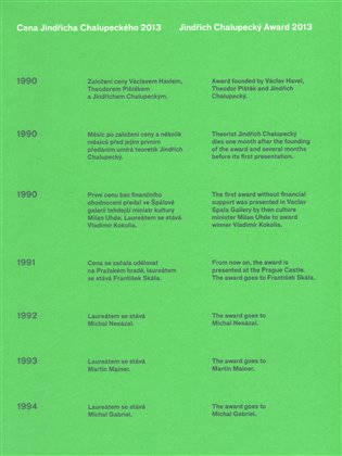 Katalog prestižní výtvarné ceny se tentokrát neváže pouze na výstavu finalistů 2013 (Daniela Baráčková, Aleš Čermák, Dominik Lang, Václav Magid a Richard Nikl), ale zaznamenává celoroční činnost Společnosti Jindřicha Chalupeckého i její historii v kostce. Společnost založili v roce 1990 Václav Havel, Jiří Kolář a Theodor Pištěk ve jménu známého výtvarného teoretika, který vždy podporoval mladé umělce. Soutěž je určena výtvarníkům do 35 let, každoročně laureáta vybírá mezinárodní porota z přihlášených a nominovaných umělců. Katalog přináší časovou osu 24 ročníků ceny, nabízí ukázky z doprovodných programů 5 umělců, 5 měsíců, 5 míst z celé republiky, představuje současnou porotu v čele s Christianem Rattemeyerem, kurátorem newyorského MoMA, kompletní portfolia finalistů, rozhovory se soutěžícími, záběry z instalace výstavy a výsledných prezentací v Národní galerii v Praze.