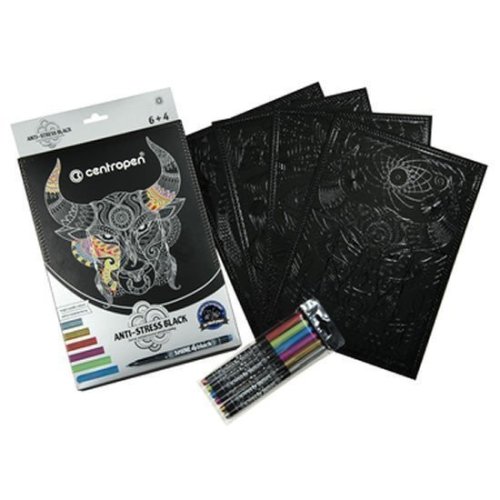 Anti-Stress Black 9390 - Antistresové omalovánky černé - Setshinne Unikátní kreativní souprava černých omalovánek a metalických popisovačů pro chvíle relaxace. Vybarvením omalovánek metalickými fixy získáte jedinečný zářivý obrázek. Motivy omalovánek jsou vytištěny transparentním lakem na kvalitním černém papíru. Metalické popisovače se sytými inkousty s 1 mm tenkou stopou jsou ideální k vybarvování jemných detailů. Sada obsahuje 4 černé omalovánky A4 a 6 metalických popisovačů. ERGO držení Válcový hrot Šířka stopy 1 mm