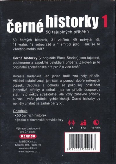 Jde o originální společenskou hru pro dva a více hráčů. 50 černých historek, 31 zločinů, 49 mrtvol, 11 vražd, 12 sebevražd a jedno otrávené jídlo. Jak se to vše mohlo stát? Černé historky jsou zapeklité, morbidní a mysteriózní záhady pro teenagery a dospělé s jakýmkoliv vztahem k hrám. Hráči se snaží zrekonstruovat celou historku pomocí otázek, na které jim moderátor odpovídá pouze "ano" nebo "ne". Strašidelná hra na jakoukoliv párty, k vodě nebo třeba na cestu autem.