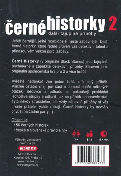 Vyřeště hádanku! Jen jeden hráč zná celý příběh. Všichni ostatní znají jen část a pomocí dobře mířených otázek, dedukce a odhadu se pokoušejí poskládat jednotlivé střípky a odhalit, jak se příběh doopravdy stal. Tyto někdy strašidelné, ale vždy zábavné příběhy si vás i vaše přátele rychle získají. Černé historky by neměly chybět na žádné párty!