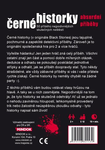 Z těchto příběhů vám budou vstávat vlasy hrůzou na hlavě. A taky se u nich zasmějete. Nejpodivnější na tom je, že tyto historky se skutečně odehrály! Ať už se jednalo o nehodu zaviněnou hloupostí, lehkomyslně provedený trik nebo žalostně neúspěšnou zkoušku odvahy - tyto historky napsal sám život! Černé historky (v originále Black Stories) jsou tajuplné, pochmurné a zapeklité detektivní příběhy. Zároveň je to originální společenská hra pro 2 a více hráčů. Pravidla hry: