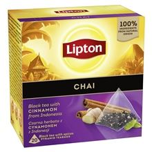 Porcovaný černý čaj Lipton v pyramidových nálevových sáčcích s příchutí chai