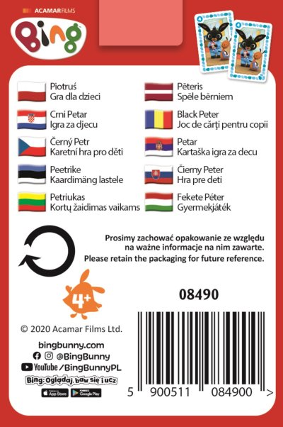 Dětská karetní hra Černý Petr s obrázky králíčkem Bingem a jeho kamarády. Všech 25 karet se rozdá zúčastněným hráčům tak, aby nebylo vidět, kdo Černého Petra dostal. Následně hráči odloží stejné dvojice karet na stůl (podložku) a zbývající karty si rozloží v ruce. Hráči si nabízí karty v kruhu a tvoří stejné dvojice. Prohraje ten, komu zůstane v ruce Černý Petr. Balení: 25 karet v papírové krabičce