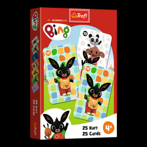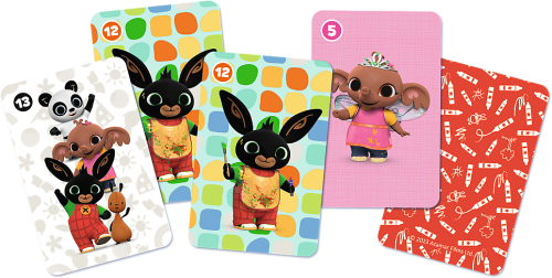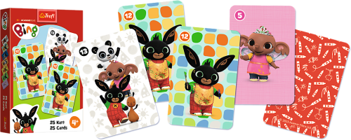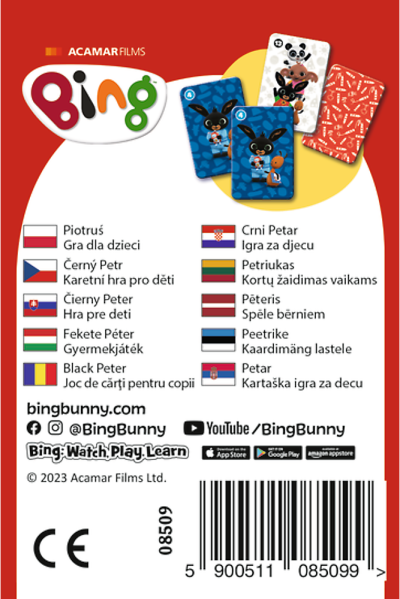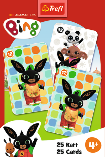 Kdo se zbaví všech svých karet se stejným označením a komu na konci hry zůstane v ruce Černý Petr? Hrou Vás bude doprovázet Králíček Bing. Karty: 25 karet - 12 dvojic označených stejnou číslovkou + 1 Černý Petr Rozměr krabičky: 6 x 9 cm Vhodné od 4 let