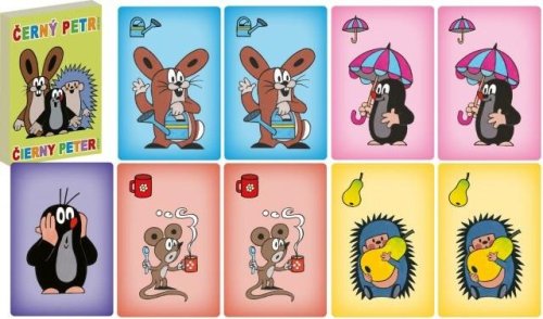 24 karet + karta s černým Petrem + karta s návodem ke hře , materiál krabičky i karet pevný karton s lesklou povrchovou úpravou-voděodpudivá, krabička papírová z důvodu tradice i bezpečnosti dětí, na výrobek byla udělena ocenění "česká kvalita" a "bezpečná a kvalitní hračka"