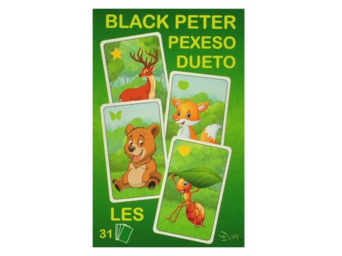 Hra Černý Petr přináší dětem i dospělým zábavu, poučení a rozvíjí schopnosti a dovednosti dětí. Pexeso je hra zaměřená na rozvoj koncentace, paměti, bystrosti a trpělivosti. Dueto je karetní hra, jejímž cílem je shromáždit dvojici k sobě příslušejících karet. Balení obsahuje sadu her 3v1 v designu lesa. Určené pro děti ve věku od 3 let.