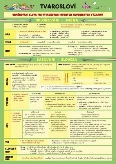Tato laminová kartička je určená především pro studenty základní a střední školy. Studenti se zde v přehledné formě dozvědí, jakým způsobem se v češtině tvarují slova, co je to pád, rod, číslo, vzor a podle jakých pravidel dojdeme k jejich správnému užití. V tomto hezkém provedení by tato karta měla studentům sloužit jako odrazový můstek ke správnému praktickému užití látky během studia.