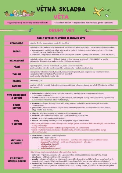 Tato laminová kartička je určená především pro studenty základní a střední školy. Na této kartě je studentům velmi srozumitelně podána problematika českého souvětí. Najdou zde druhy vět, druhy souvětí, druhy vět vedlejších, poměry mezi větami či větné členy. V tomto hezkém provedení by tato karta měla studentům sloužit jako odrazový můstek ke správnému praktickému užití látky během studia.