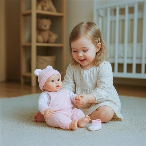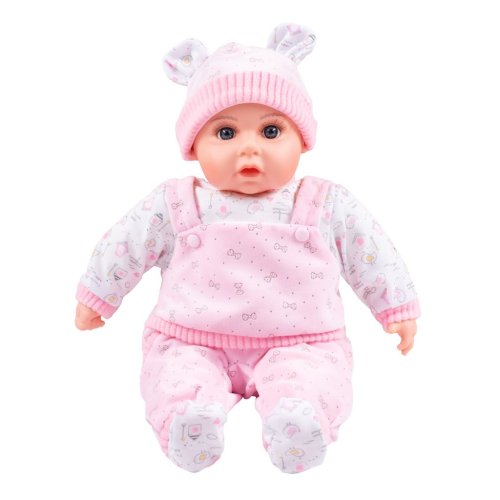 Dětská panenka PlayTo. Hlava, ruce a nohy jsou vyrobeny z gumy, tělíčko pak z měkkého materiálu. Panenka má milou tvářičku, která vypadá jak opravdové miminko. Délka panenky je 46 cm a je zabalená v krásné, barevné krabici. Panenka má česky mluvící modul, který se nachází v kapsičce na bříšku. Modul po stisknutí přehrává 5 písní a mluví 14 českých vět. <BR>Panenka zpívá tyto české písničky:<BR>- Travička zelená<BR>- Skákal pes <BR>- Prší, prší<BR>- Holka modrooká<BR>- Šla Nanynka<BR>Panenka mluví tyto české věty:<BR>- Hraj si se mnou<BR>- Dej mně spinkat maminko<BR>- Maminko hraj si se mnou<BR>- Zpívej se mnou<BR>- Obejmi mě<BR>- Tatínku mám Tě moc ráda<BR>- Tatínku hraj si se mnou<BR>a další.<BR>Modul je napájen 3 kulatými bateriemi 1,5V ( AG13,LR44-kulaté), testovací baterie jsou součástí balení. Rozměry krabice: vxšvh: 47x28x12 cm. Vhodné pro děti od 3 let.